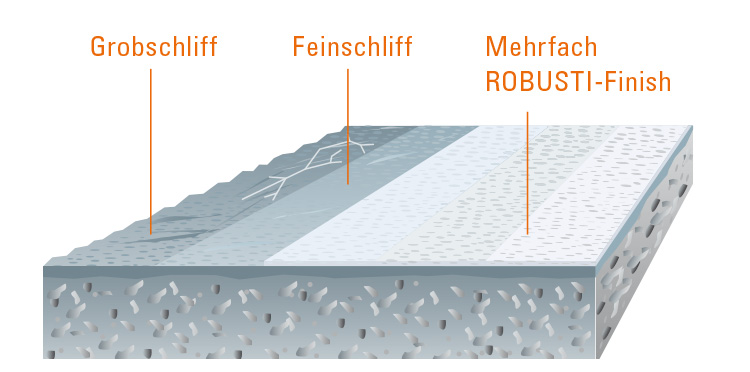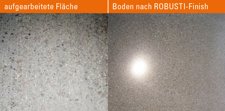 Unser neues ROBUSTIBODENLIFTING sorgt für eine Frischzellenkur Ihrer bestehenden Böden. Es erhält die positiven Eigenschaften eines Betonbodens und behebt durch sein aufwändiges Finish die standardmäßigen Nachteile.Die Böden erhalten eine deutlich höhere Ebenheit, glattere Oberfläche und verbesserte Verschleißfestigkeit. Dadurch werden Arbeitssicherheit, Pflegefreundlichkeit und Optik nachhaltig verbessert. So können belastbare Flächen kombiniert mit ansprechender Optik mit einem sehr guten Kosten-Nutzen-Verhältnis erstellt werden. Dabei kann die Produktion in der Zwischenzeit weiterlaufen, da mit dem ROBUSTIBODENLIFTING auch nur Teilflächen bearbeitet werden können und trotzdem eine gleichmäßige Gesamtfläche gewährleistet ist.